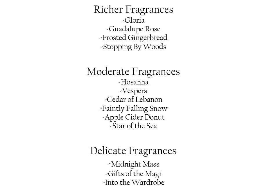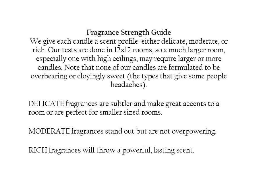 FRAGRANCE STRENGTH INFORMATION: Along with fragrance descriptions, we give each candle a scent profile: either delicate, moderate, or rich. Our tests are done in rooms from 10x10 to 12x12, so a much larger room, especially one with high ceilings, will require larger candles (such as our 16oz variety). DELICATE fragrances are subtler and make great accents to a room or are perfect for smaller sized rooms. MODERATE fragrances stand out but are not overpowering. RICH fragrances will throw a powerful, lasting scent. For those who like stronger fragrances, we suggest you try one of our moderate or richer fragrances in a 16oz jar but *note* that none of our candles are formulated to be overbearing or cloyingly sweet (the types that give some people headaches). CANDLE INSTRUCTIONS: Make sure the wick is trimmed to about 1/3 of an inch before lighting. For first burn, ensure that the melted wax forms a complete ring around the jar before blowing out the candle. Otherwise, the candle will 'tunnel' and will risk drowning the wick in wax in subsequent burns. Do not burn for more than 4 hours maximum. Do not leave candle unattended. Hand-poured, 100% soy wax candles with zero additives. Our fragrances are inspired by New England and Catholic life.