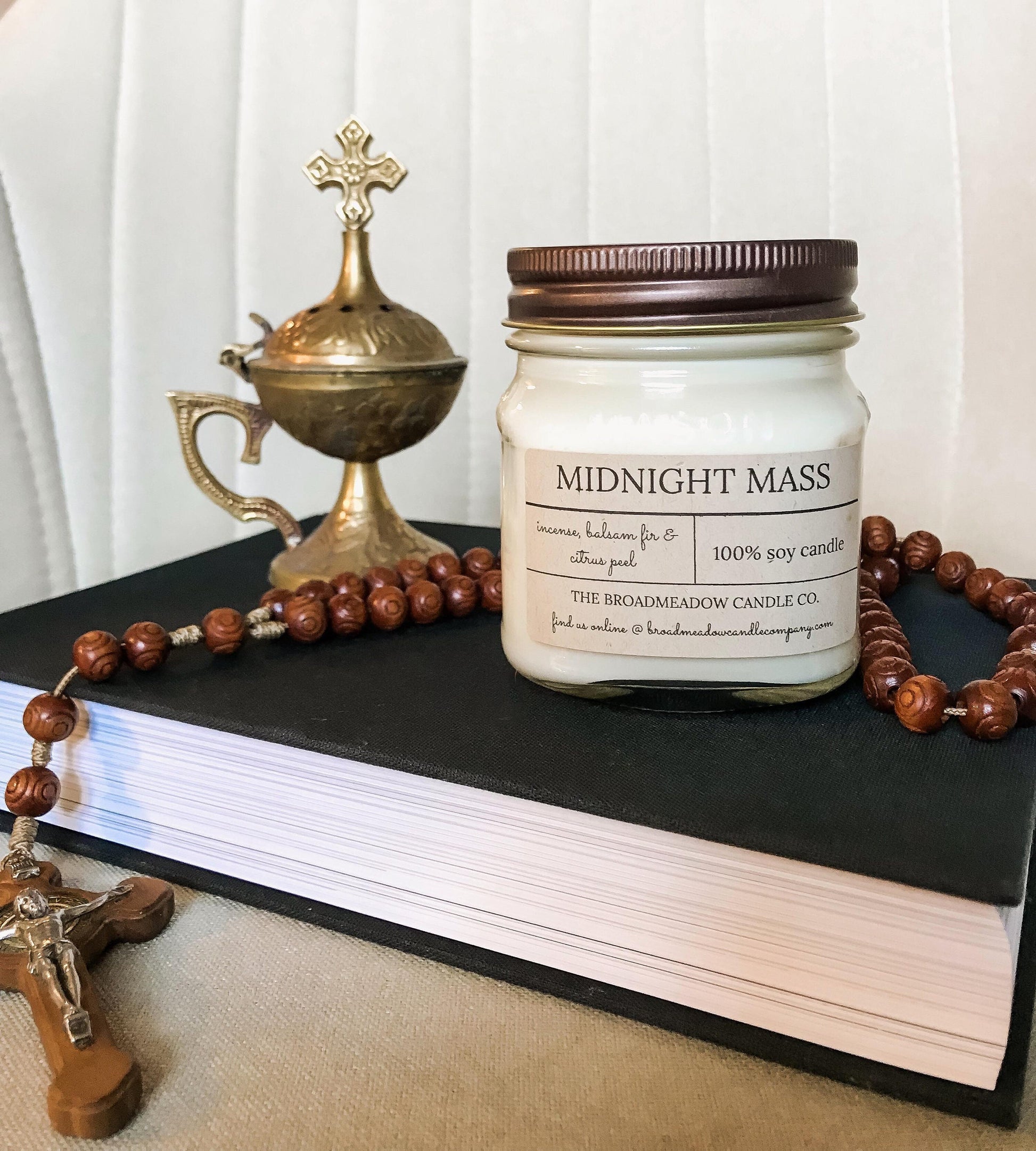 FRAGRANCE STRENGTH INFORMATION: Along with fragrance descriptions, we give each candle a scent profile: either delicate, moderate, or rich. Our tests are done in rooms from 10x10 to 12x12, so a much larger room, especially one with high ceilings, will require larger candles (such as our 16oz variety). DELICATE fragrances are subtler and make great accents to a room or are perfect for smaller sized rooms. MODERATE fragrances stand out but are not overpowering. RICH fragrances will throw a powerful, lasting scent. For those who like stronger fragrances, we suggest you try one of our moderate or richer fragrances in a 16oz jar but *note* that none of our candles are formulated to be overbearing or cloyingly sweet (the types that give some people headaches). CANDLE INSTRUCTIONS: Make sure the wick is trimmed to about 1/3 of an inch before lighting. For first burn, ensure that the melted wax forms a complete ring around the jar before blowing out the candle. Otherwise, the candle will 'tunnel' and will risk drowning the wick in wax in subsequent burns. Do not burn for more than 4 hours maximum. Do not leave candle unattended. Hand-poured, 100% soy wax candles with zero additives. Our fragrances are inspired by New England and Catholic life.